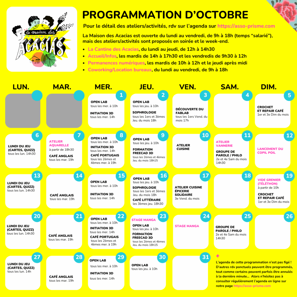 La Maison des Acacias, Tiers-Lieu Solidaire, Culturel et Numérique est un projet porté et animé par PRiSME et le « super » collectif de la Maison des Acacias (composé de salariés, d’administrateurs, d’usagers, d’adhérents/bénévoles, de curieux, d’utopistes réalistes…) qui ne cesse de grandir et qui est ouvert à toute personne souhaitant faire partie de cette aventure collective !
